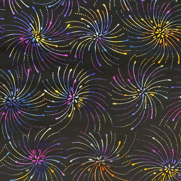 A MAGNIFICENT FABRIC ILLUMINATED WITH SHIMMERY COLORFUL METALLIC FIREWORKS-LIKE SPARKLING ACCENTS AND LUSTROUS, WAVE-LIKE MOTIFS DANCING DRAMATICALLY ACROSS A STARK BLACK BACKDROP, CREATING A STRIKING SENSE OF MOVEMENT AND VISUAL RHYTHM.